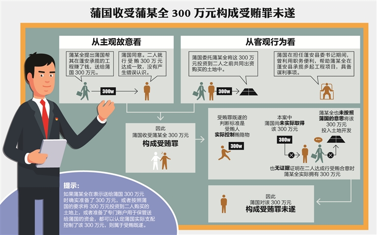 当然,如果蒲某全在表示送给蒲国300万元时确实准备了300万元,或者其后按照蒲国的要求将300万元投资到二人购买的潆溪土地上,或者准备了专门账户用于保管送给蒲国的资金,都可以认定蒲国实际支配控制300万元,受贿300万元既遂。